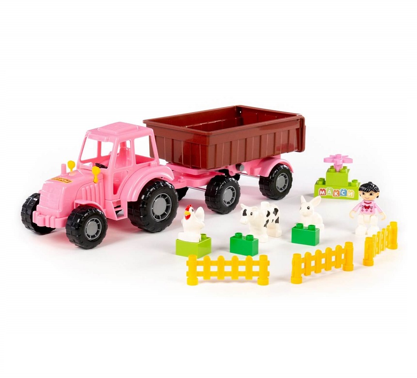 Полесье. Трактор "Мастер" (розовый) с прицепом №1+ конструктор "Макси" (13 эл.) (в сетке) арт.58939