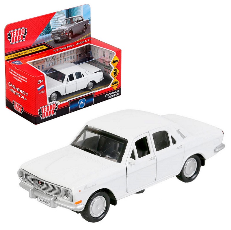 Технопарк. Газ-2401 "Волга" 12 см, металл, двери, багаж, инерц, белый, кор. арт.2401-12-WH