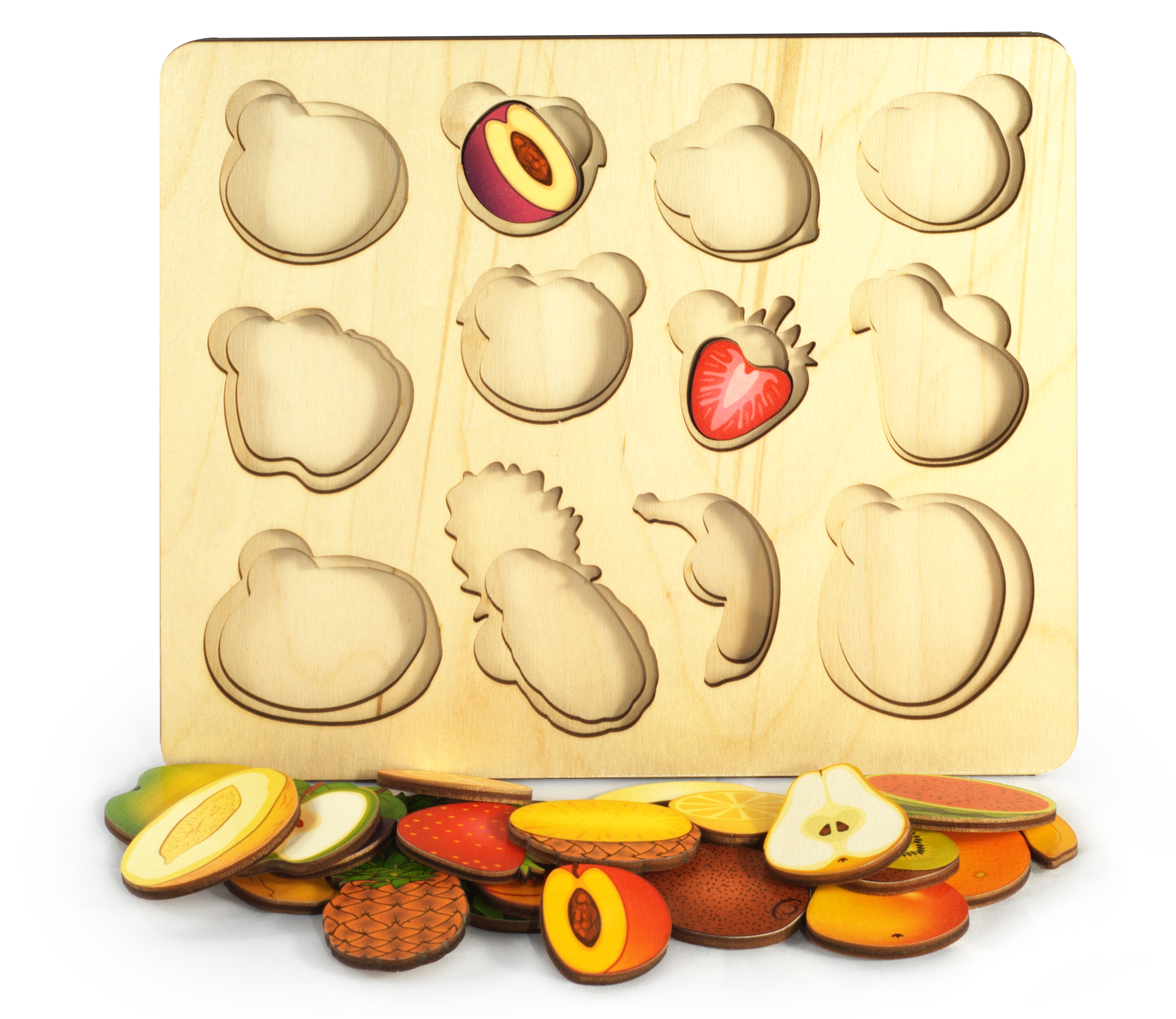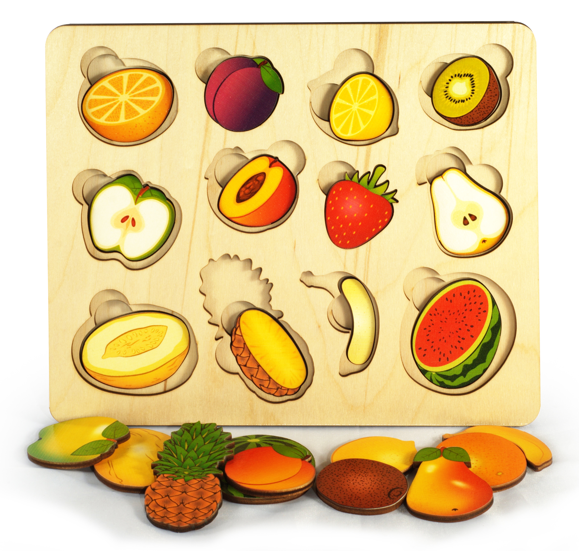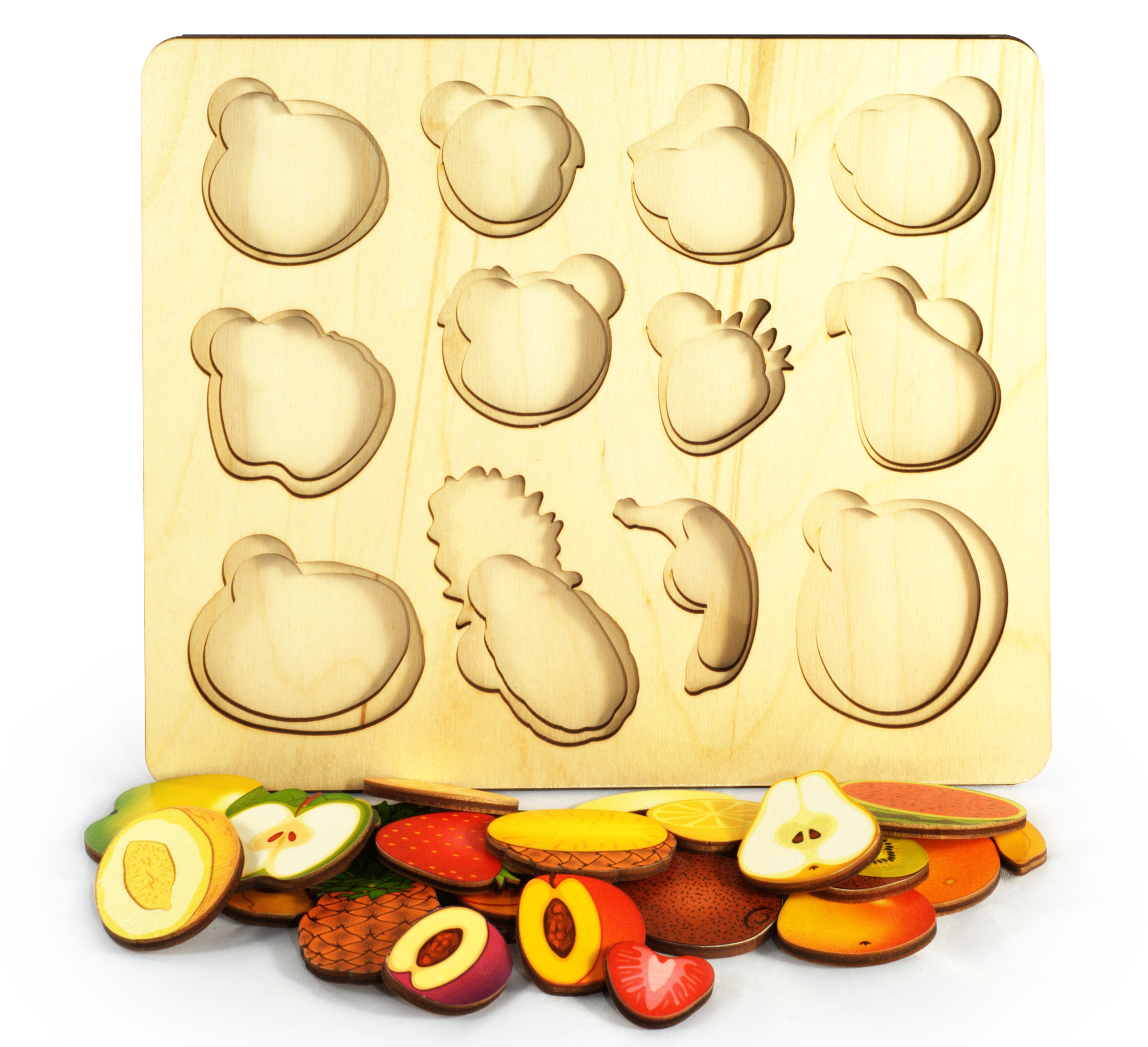 Когда все фрукты и их части будут правильно разложены на столе, можно начинать размещать вкладыши в ячейки в соответствии с их контурами.