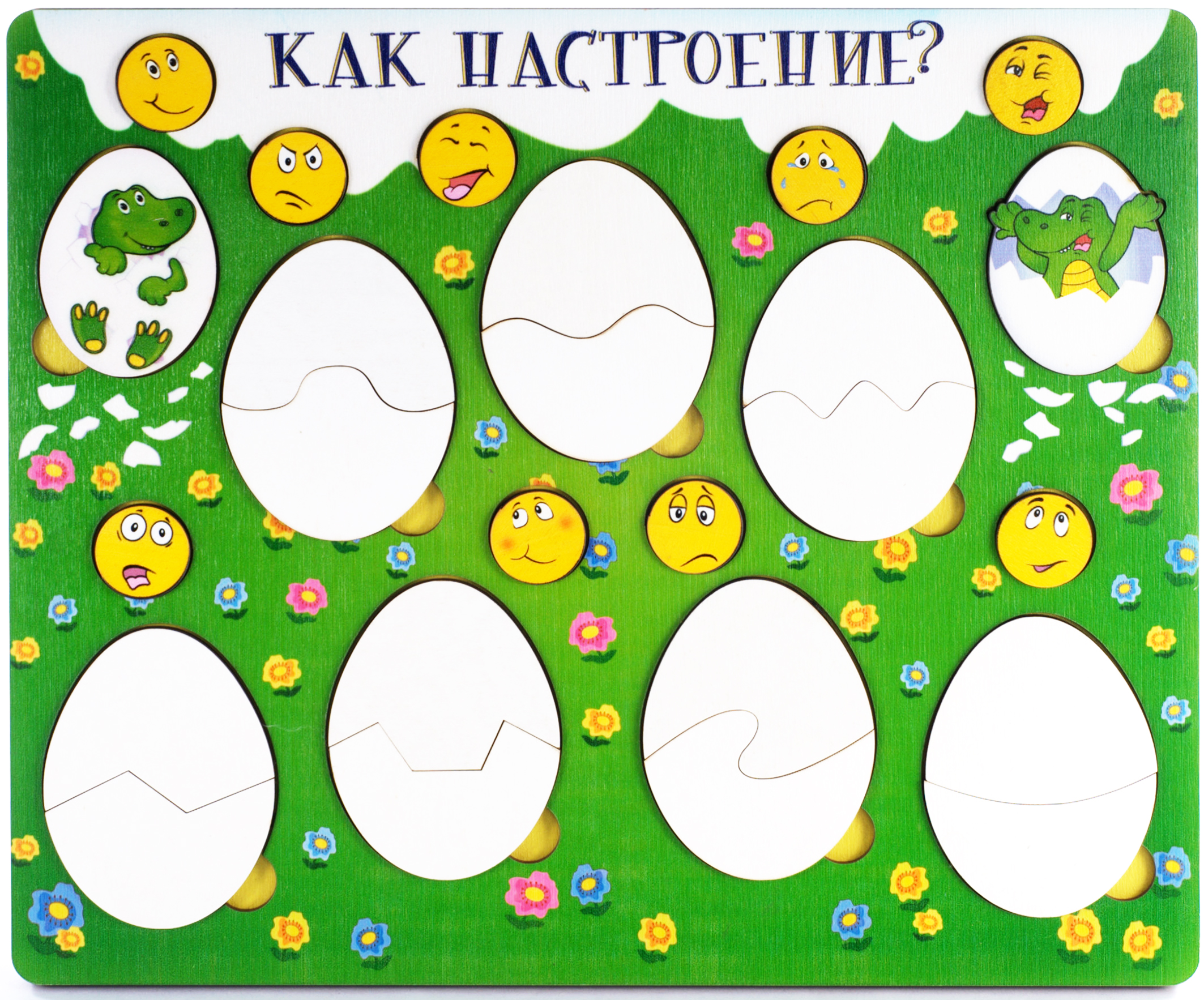 Предложите ребенку внимательно рассмотреть смайлики на игровой доске, попросите найти сердитый, задумчивый, грустный, радостный, испуганный и т.д. Помогите малышу, если он затрудняется с ответом. Вместе посмотрите, кто спрятался под яйцами. Как можно охарактеризовать настроение каждого крокодильчика? В чем это проявляется? .