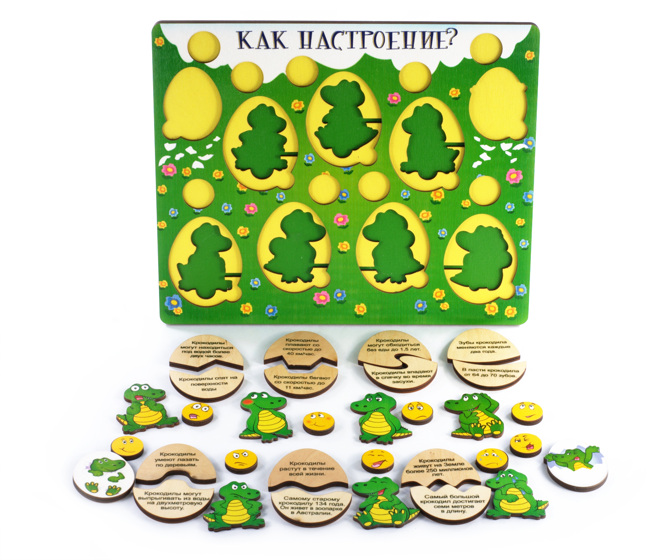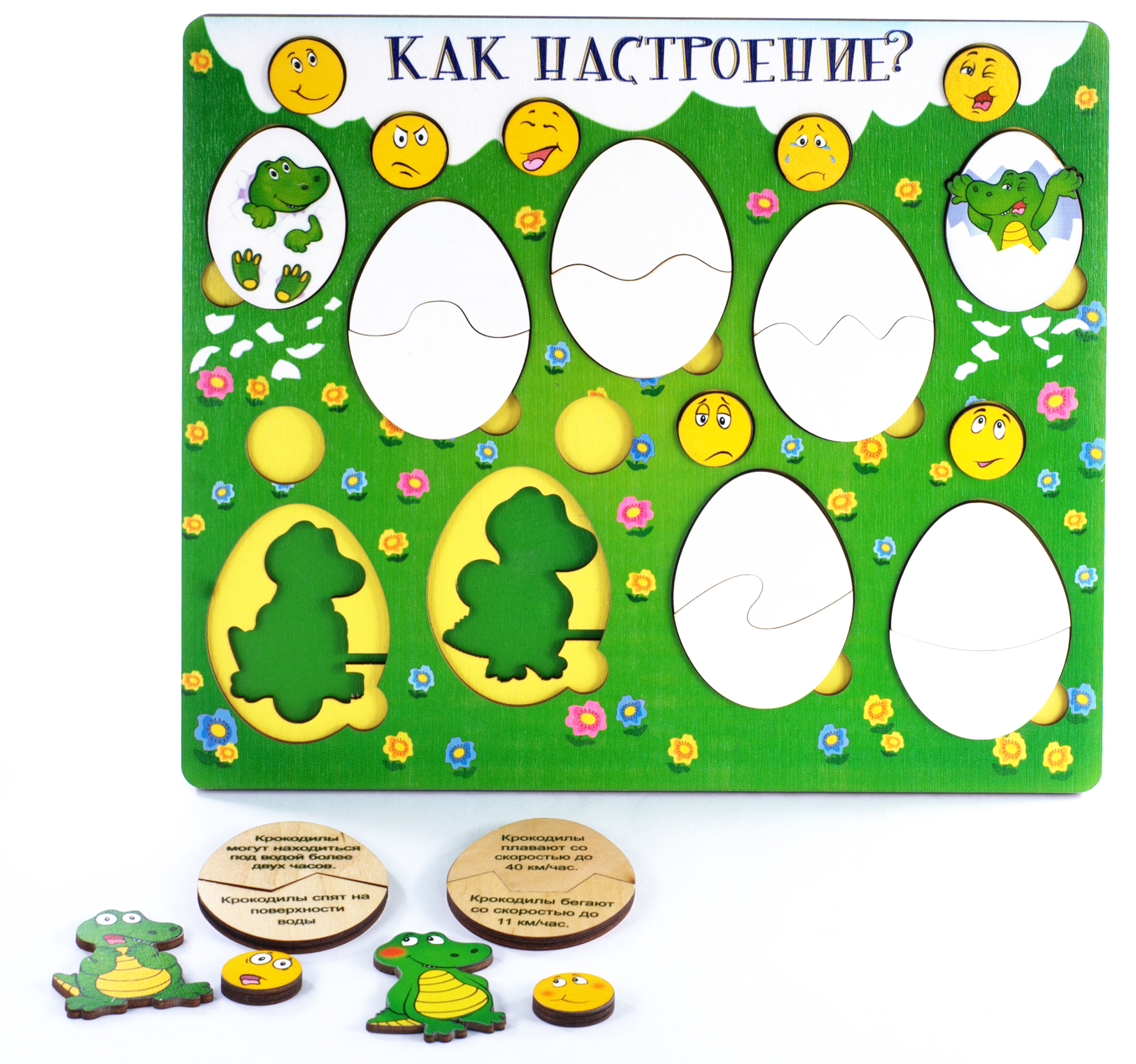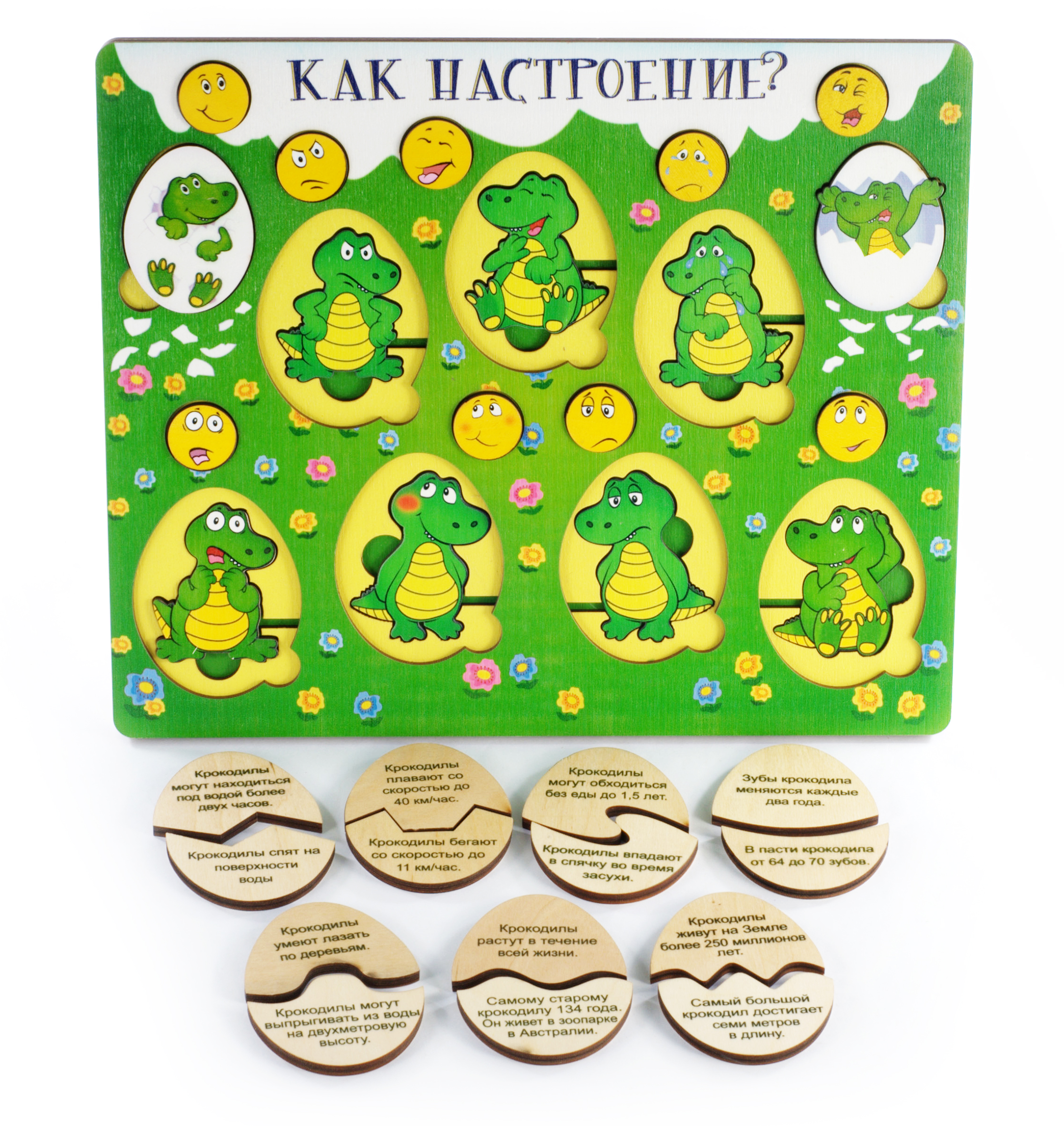 Деревянная доска "Как настроение?" - это игровая панель для развития мелкой моторики, внимания, воображения и усидчивости Вашего малыша, с помощью которой в увлекательной игровой форме ребенок познакомится с такими понятиями как чувства, эмоции и настроение и их мимическими проявлениями, научится составлять предмет из его частей, размещать вкладыши в ячейках в соответствии с их контурами и узнает много интересного из жизни крокодилов.