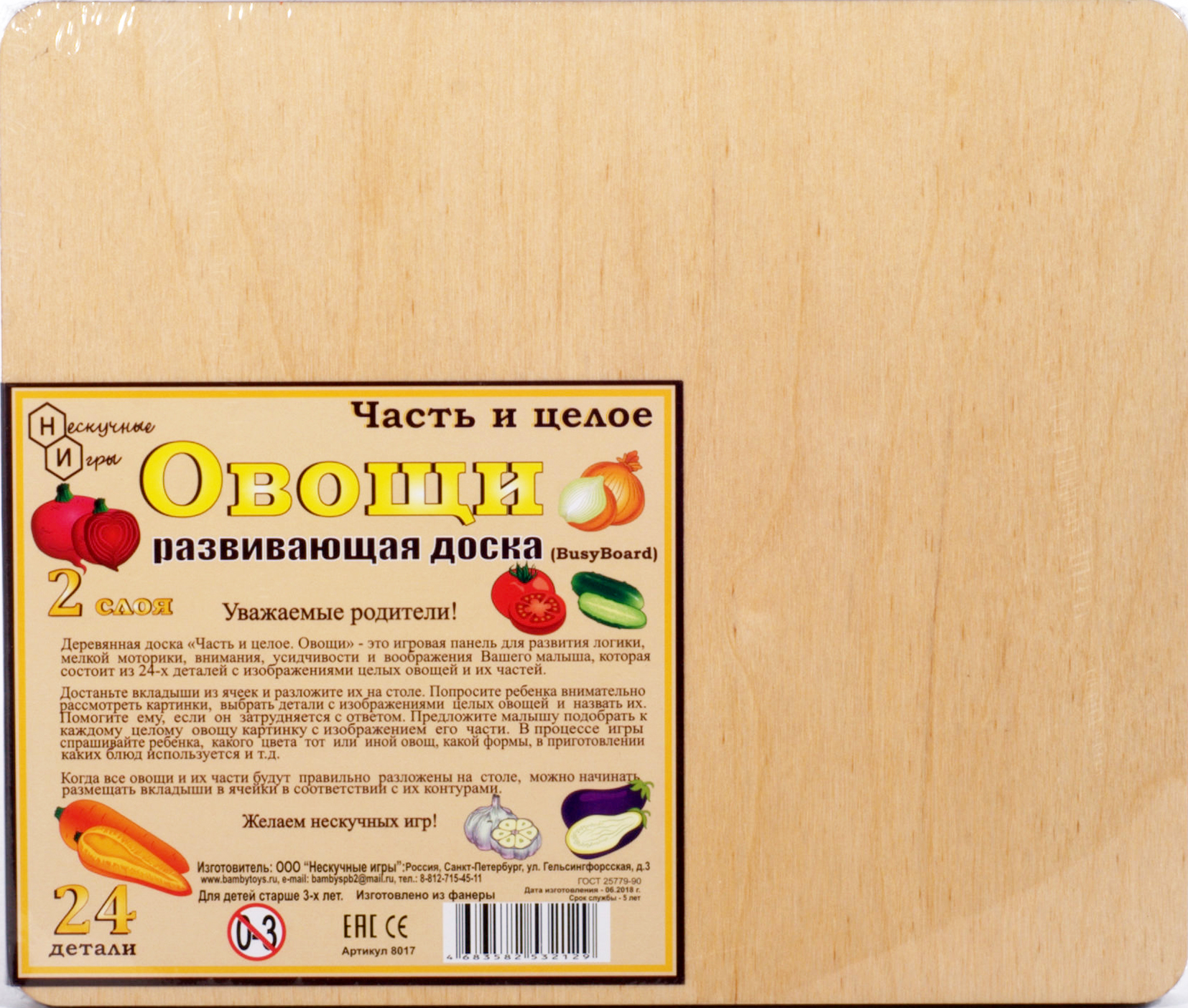 Деревянная доска "Часть и целое. Овощи" - это игровая панель для развития логики, мелкой моторики, внимания, усидчивости и воображения Вашего малыша, которая состоит из 24-х деталей с изображениеми целых овощей и их частей