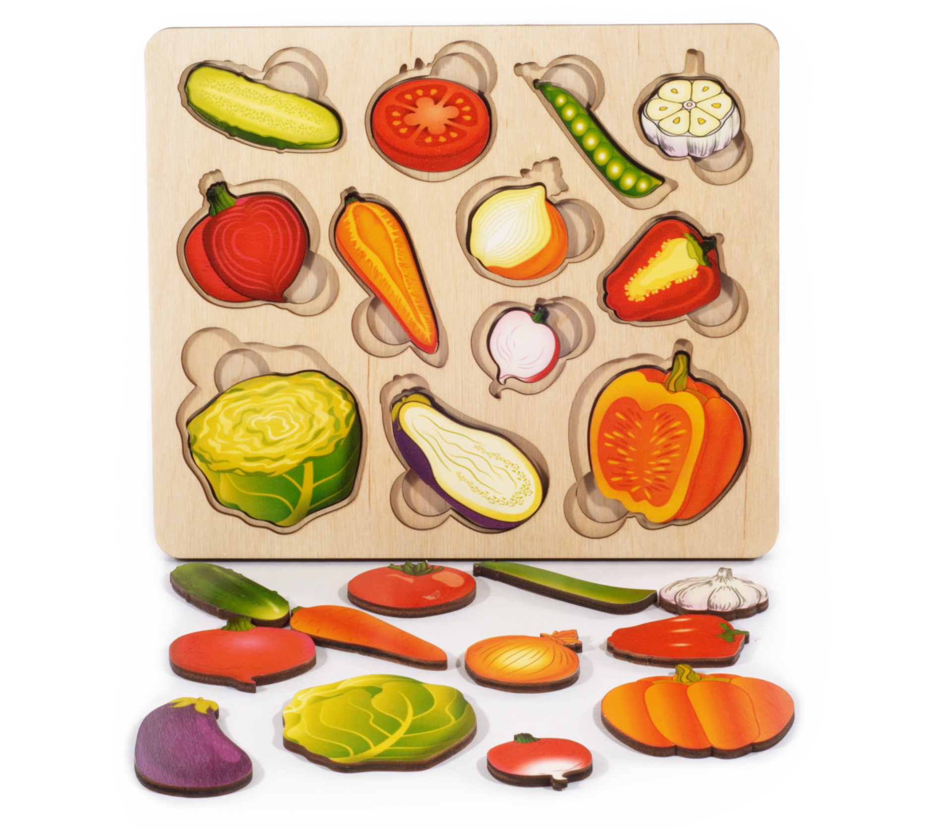 Когда все овощи и их части будут правильно разложены на столе, можно начинать размещать вкладыши в ячейки в соответствии с их контурами.