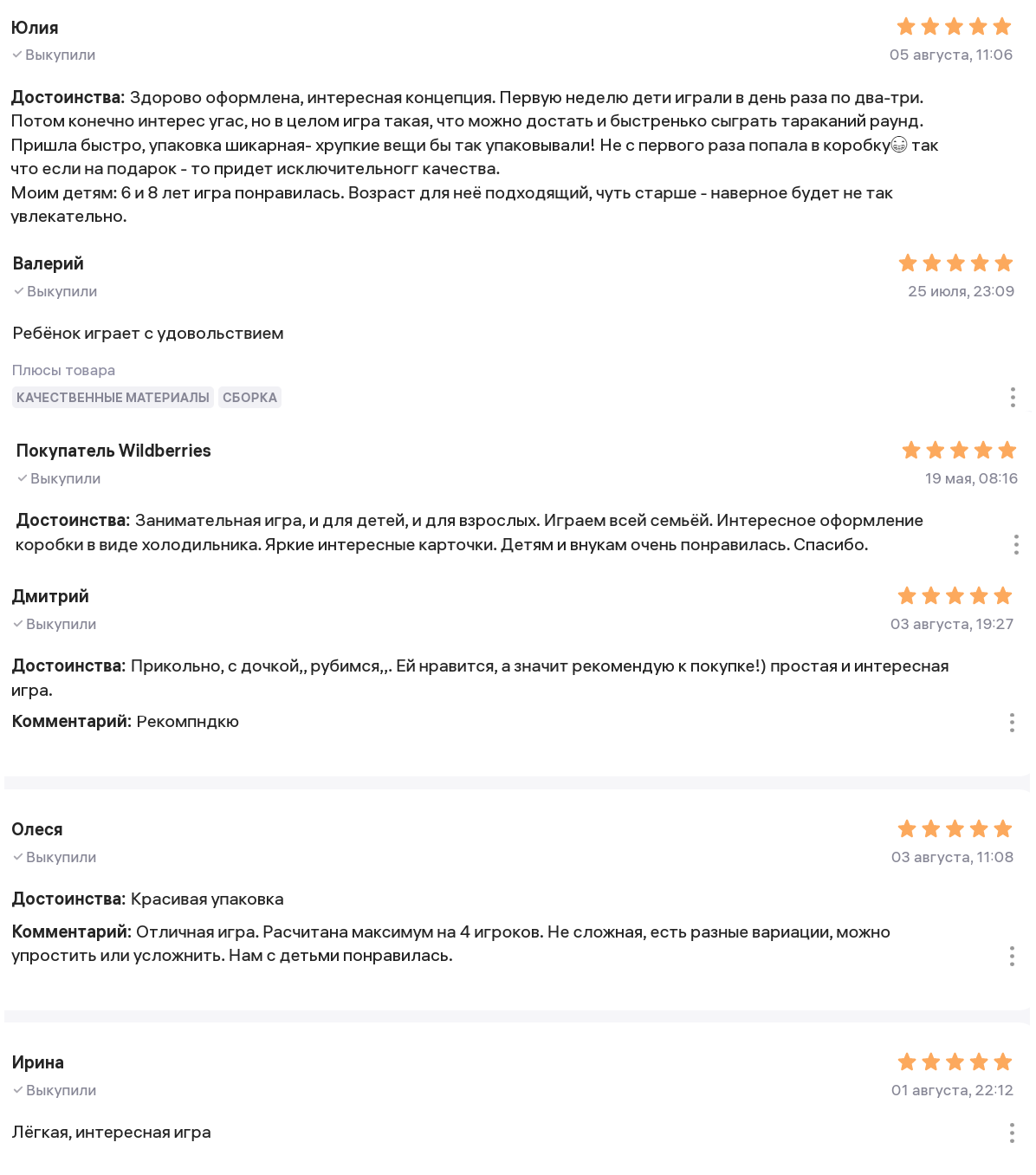 Состав: - 27 карт еды - 36 карт угроз (27 обычных, 6 сложных, 3 легких) - 12 жетонов тараканов (по 3 жетона для 4-х игроков) - жетон первого игрока - 4 шпаргалки для игроков - Иллюстрированные правила. Упаковка: картонная коробка Число игроков: 2-4 чел. Возраст: от 7 лет. Время партии: 20 мин. Некоторые отзывы: