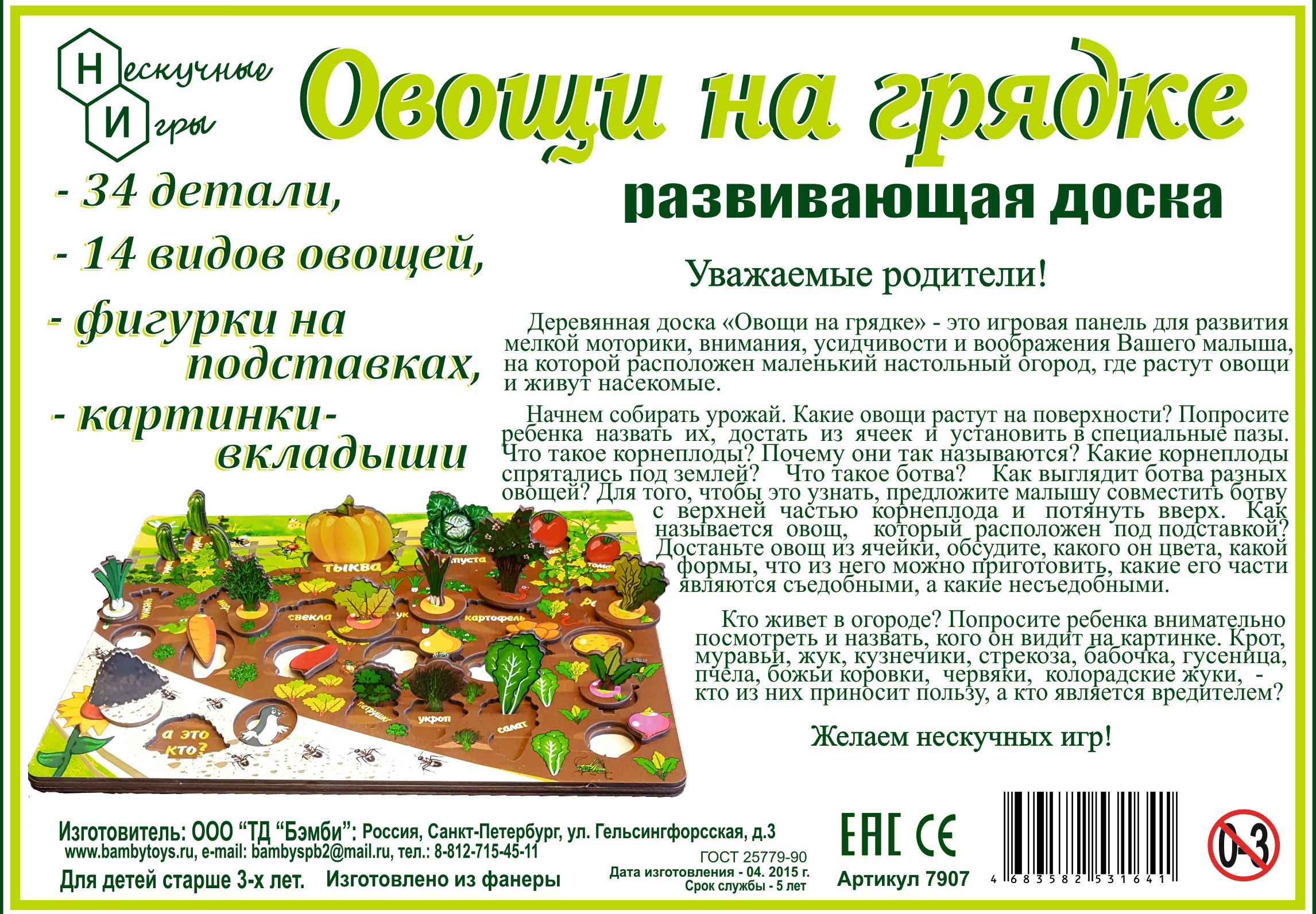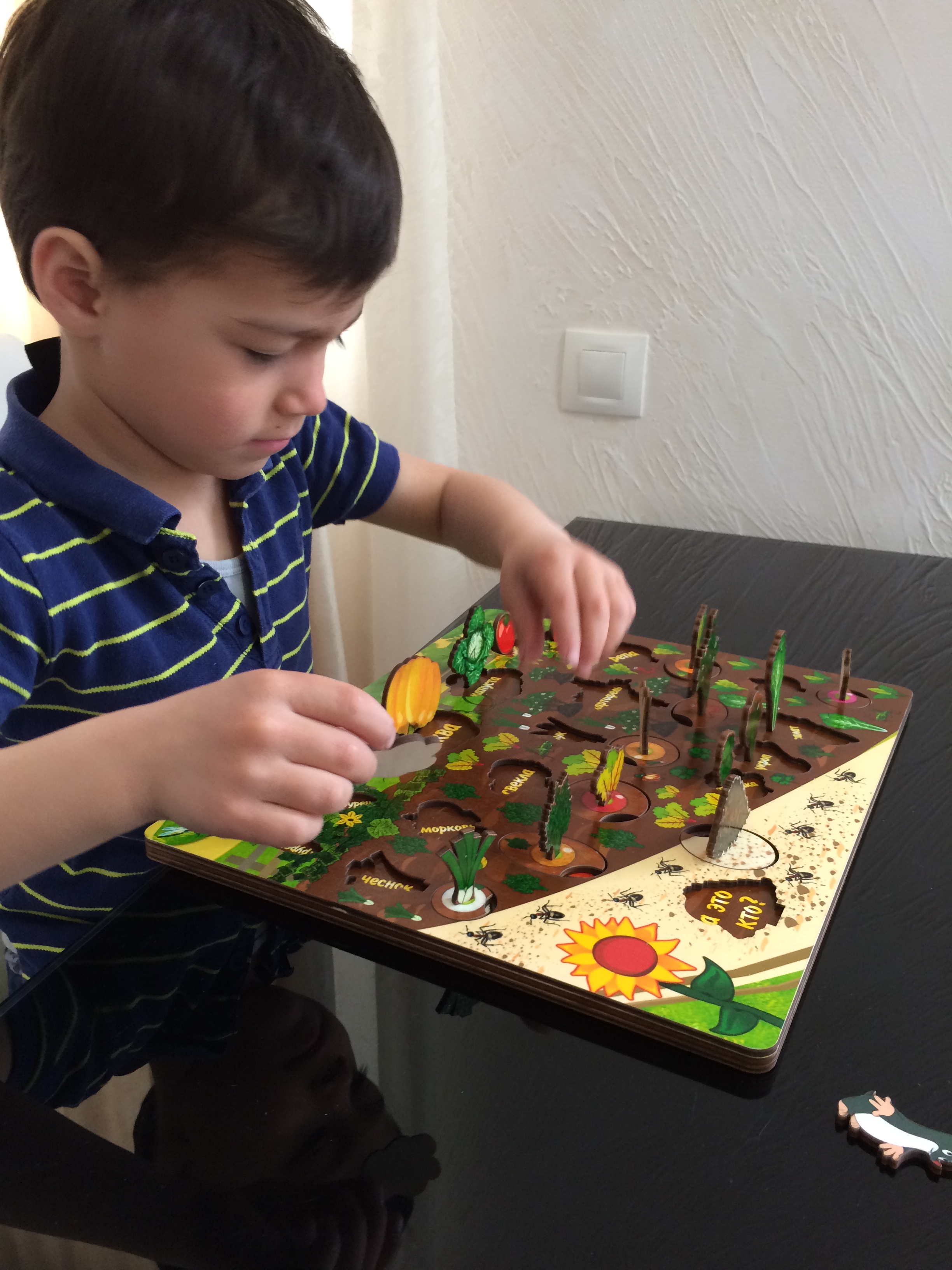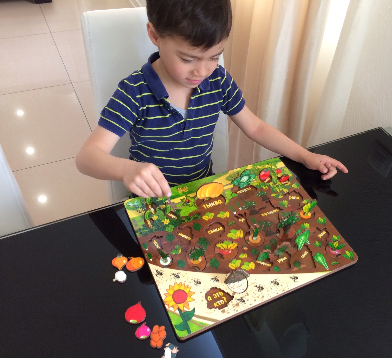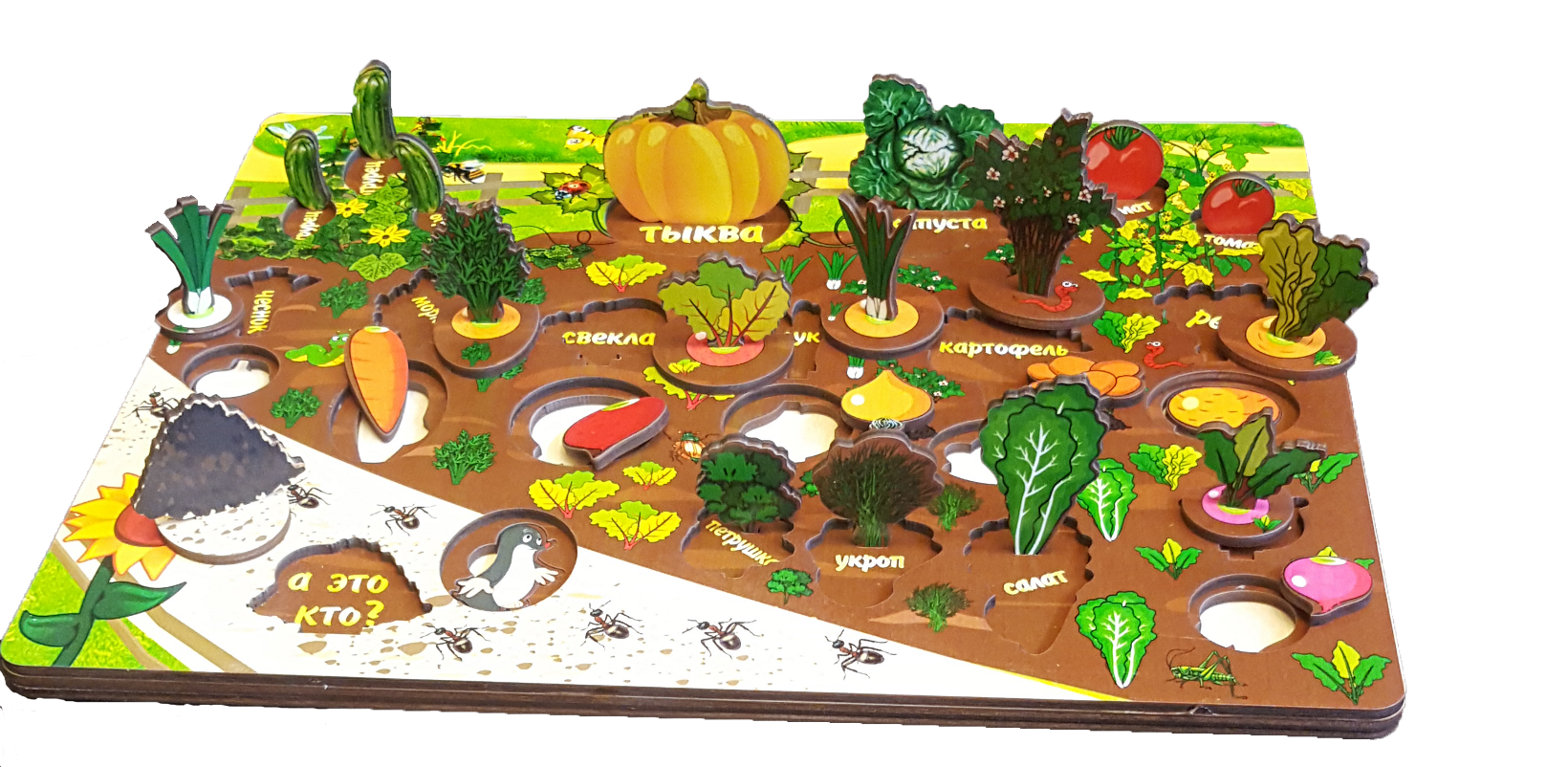 Деревянная доска "Овощи на грядке" - это игровая панель для развития мелкой моторики, внимания, усидчивости и воображения Вашего малыша, на которой расположен маленький настольный огород, где растут овощи и живут насекомые.