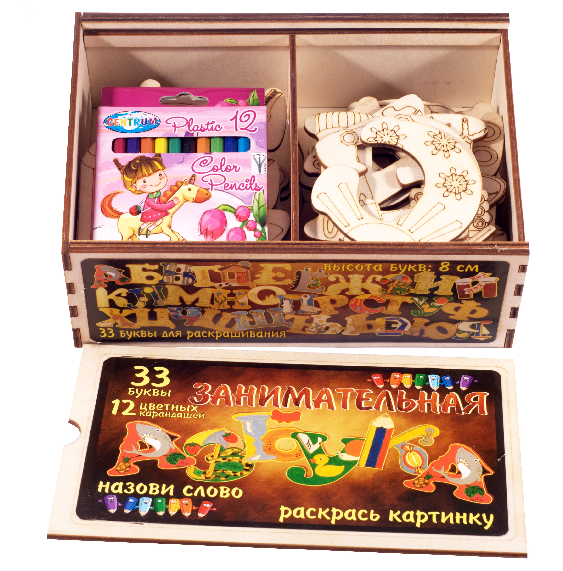 "Занимательная АЗБУКА" - это увлекательный игровой набор, который состоит из 33-х деревянных букв русского алфавита с рисунками для раскрашивания и 12-ти цветных карандашей. Предложите вашему ребенку внимательно посмотреть на каждую букву, перечислить нарисованные на ней предметы, объяснить, почему они нарисованы именно на этой букве, а не на другой. Вместе вспомните слова, которые начинаются с этой же буквы, обсудите, какие цвета вы будете использовать для раскрашивания картинок и почему. Разложите буквы в алфавитном порядке, попросите ребенка найти похожие между собой и рассказать, чем они отличаются.