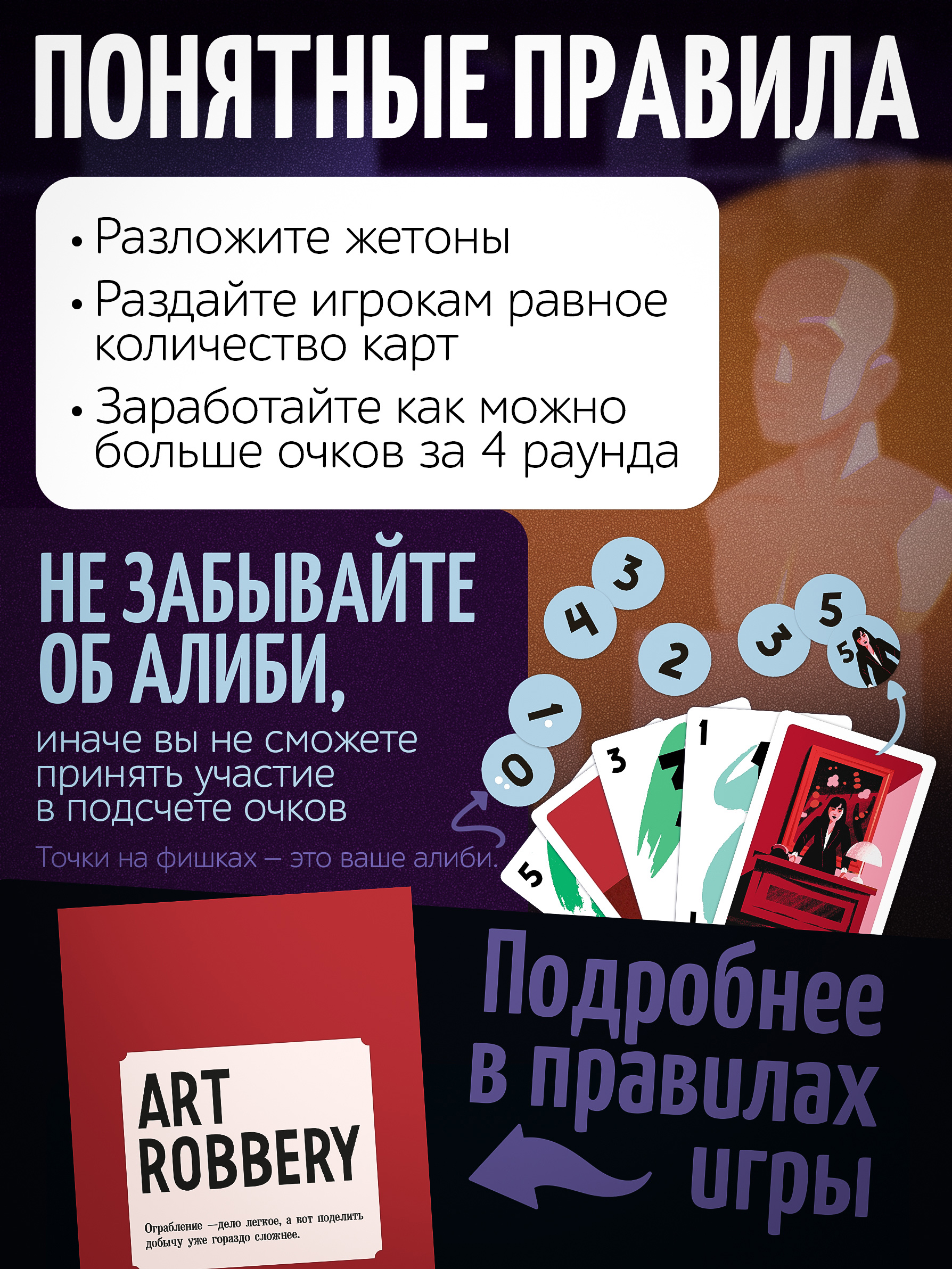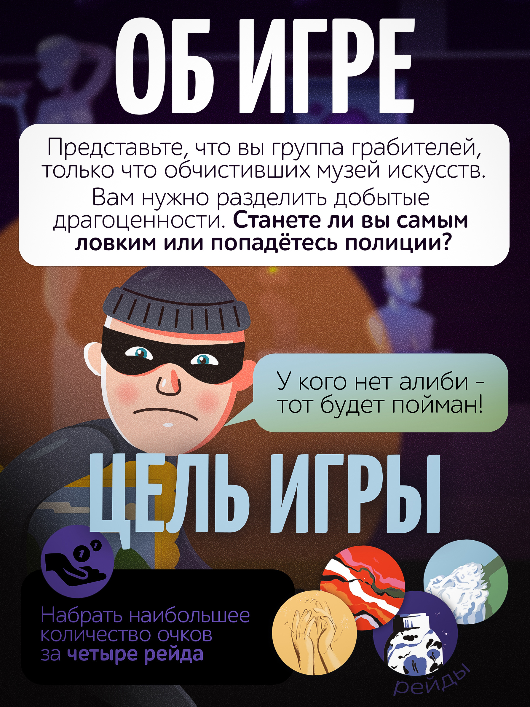 Но полиция не сдается и ищет преступников, поэтому во время игры ещё нужно собрать достаточно алиби, чтобы не быть пойманным.
