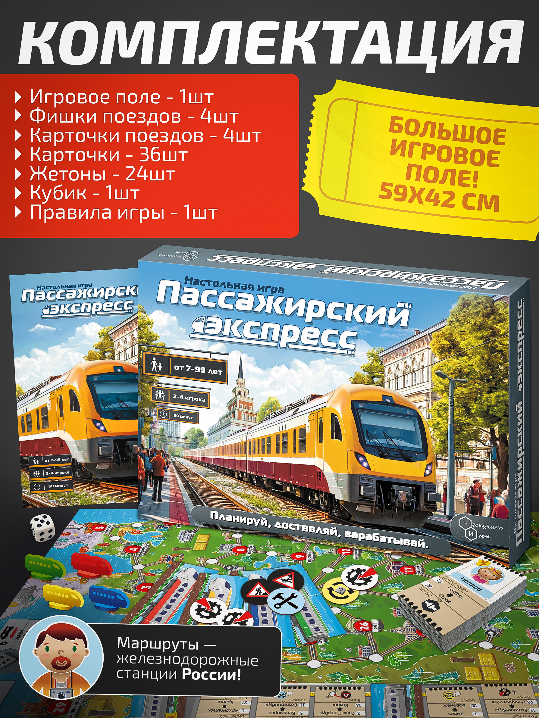 | Планируйте маршруты, чтобы как можно эффективней доставить пассажиров до необходимых им городов. В игре вам придется присоединять вагоны, ремонтировать поломки, находить объездные пути или мешать другим игрокам, блокируя дорогу. Победит тот, кто подойдет к вопросу перевозки расчетливо, дальновидно и оптимально. В игре смоделирована железнодорожная сеть европейской части России. |