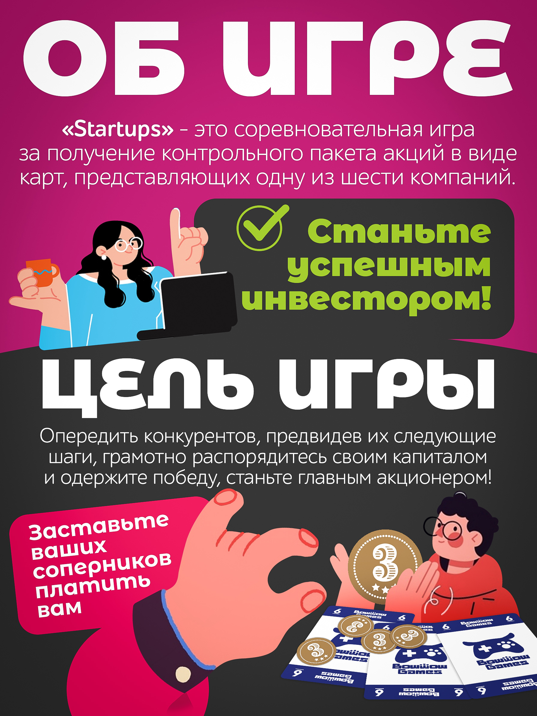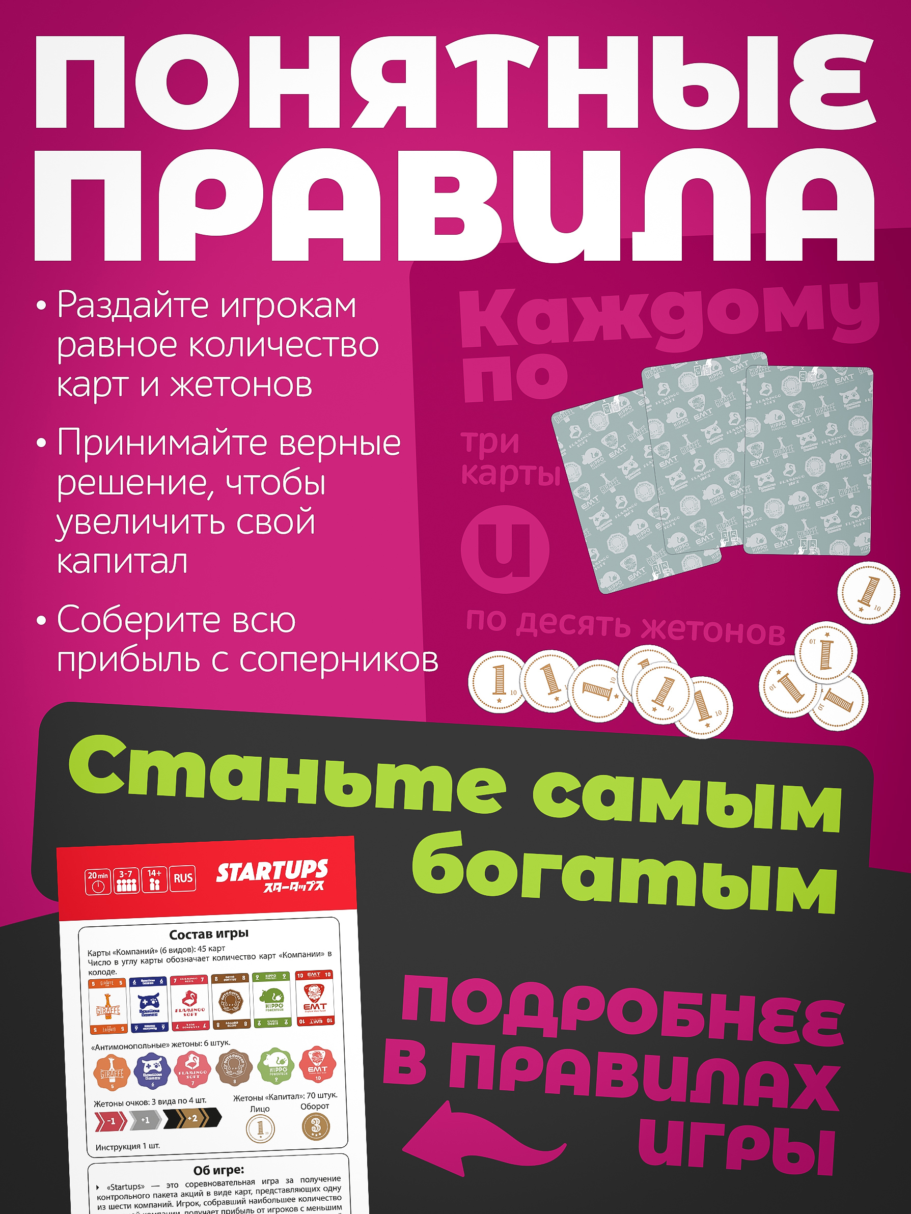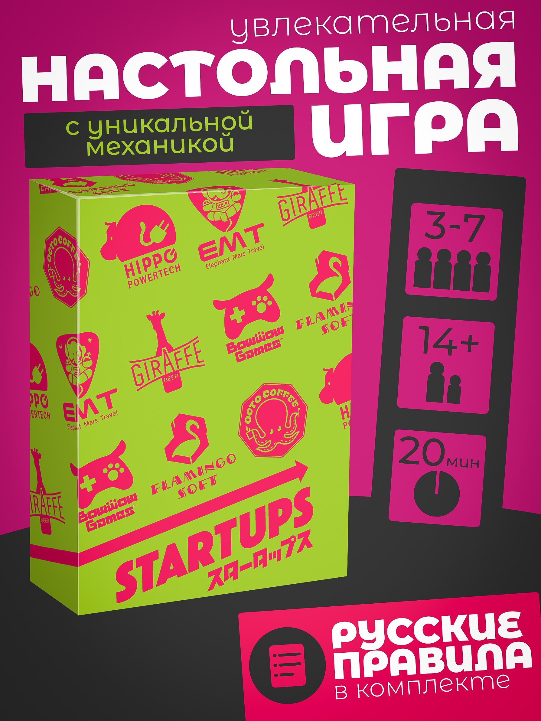 В этой игре важна не только удача, но и умение продумывать ходы и анализировать соперников! «Startups» — это отличный повод собраться с друзьями и весело провести время.