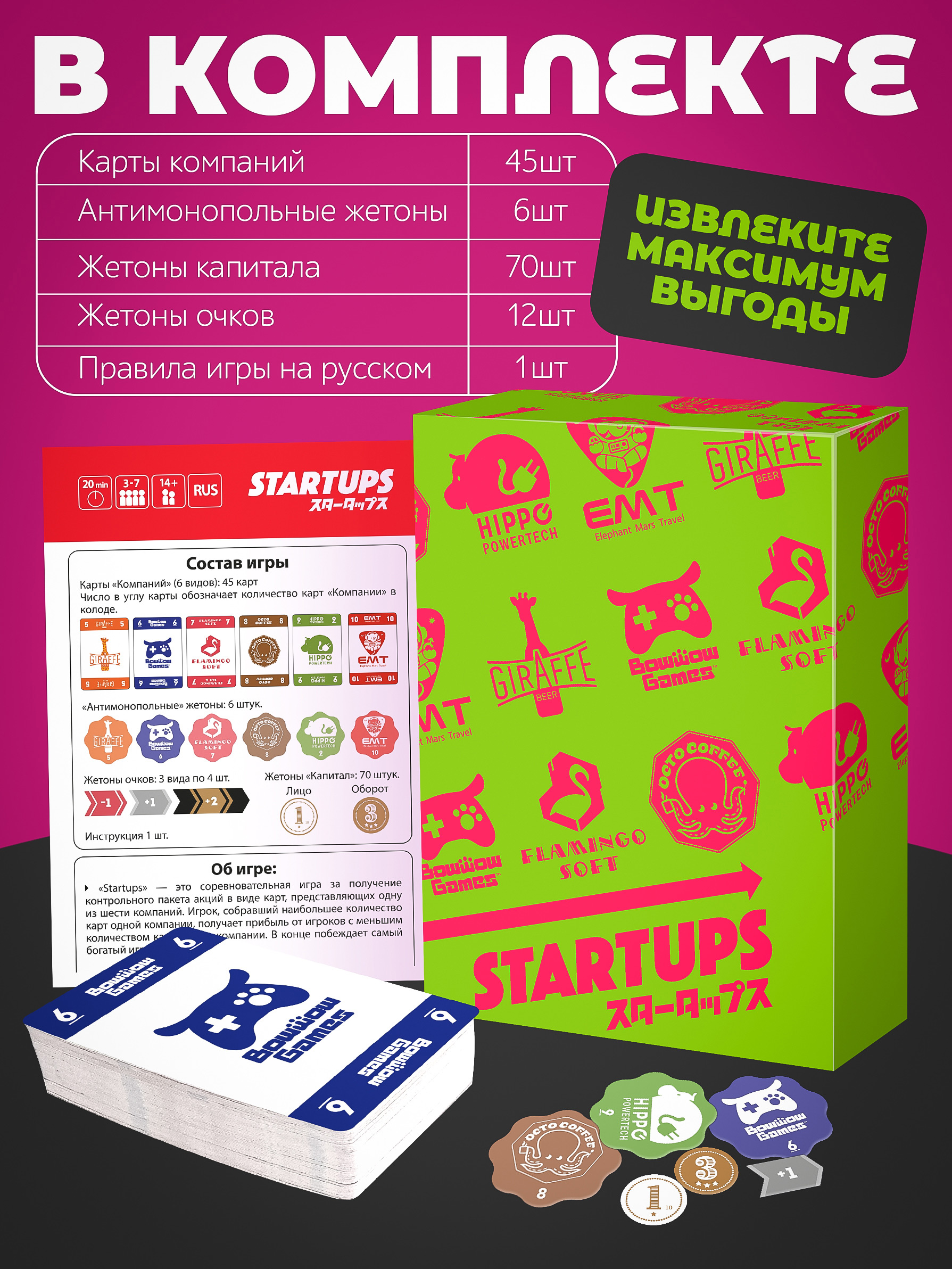 комплектация: Правила игры (rus), 45 карт компаний (6 видов), 70 жетонов капитала, 6 антимонопольных жетонов, 12 жетонов очков (3 вида по 4 штуки).